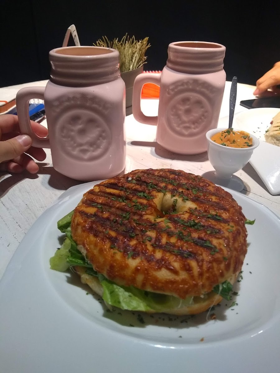 Bagel de jamón de pavo, queso manchego, tocino, jitomate fresco, queso philadelphia, lechuga.